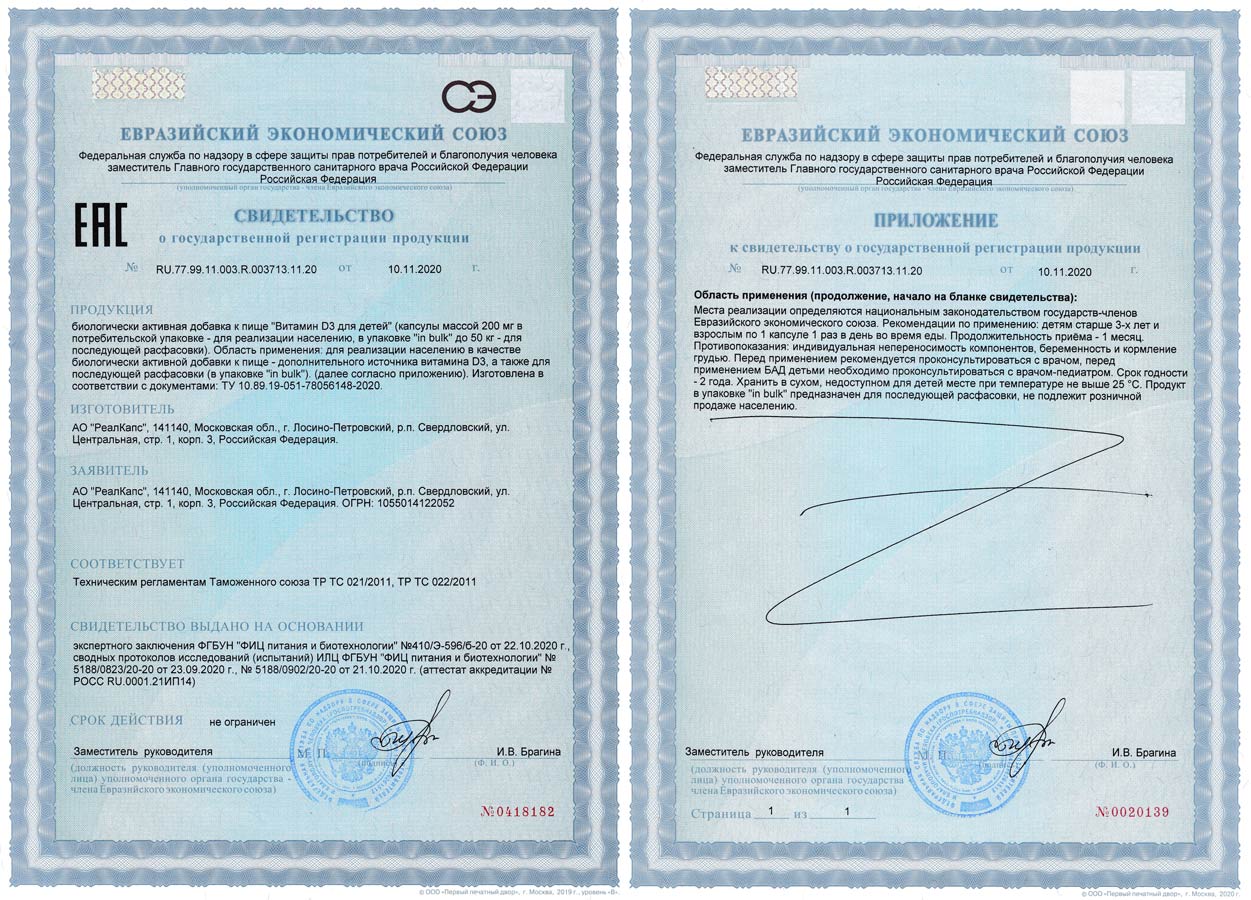 Биологически активная добавка к пище «Витамин D3 (холекальциферол) 600 ME» зарегистрирована Федеральной службой по надзору в сфере защиты прав потребителей и благополучия человека. Свидетельство о государственной регистрации № RU.77.99.88.003.R.003631.10.19 от 03.10.2019, ТУ 10.89.19-044-78056148-2019
