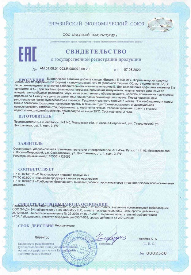 Биологически активная добавка к пище «Витамин Е 100 МЕ»: Свидетельство о государственной регистрации № AM.01.06.01.003.R.000072.08.20 от 07.08.2020, ТУ 10.89.19-052-78056148-2020.