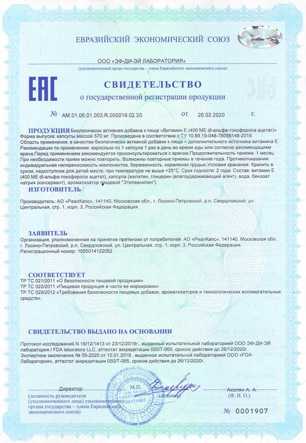 Биологически активная добавка к пище «Витамин Е 200 МЕ»: Свидетельство о государственной регистрации № AM.01.06.01.003.R.000074.08.20 от 07.08.2020, ТУ 10.89.19-053-78056148-2020.